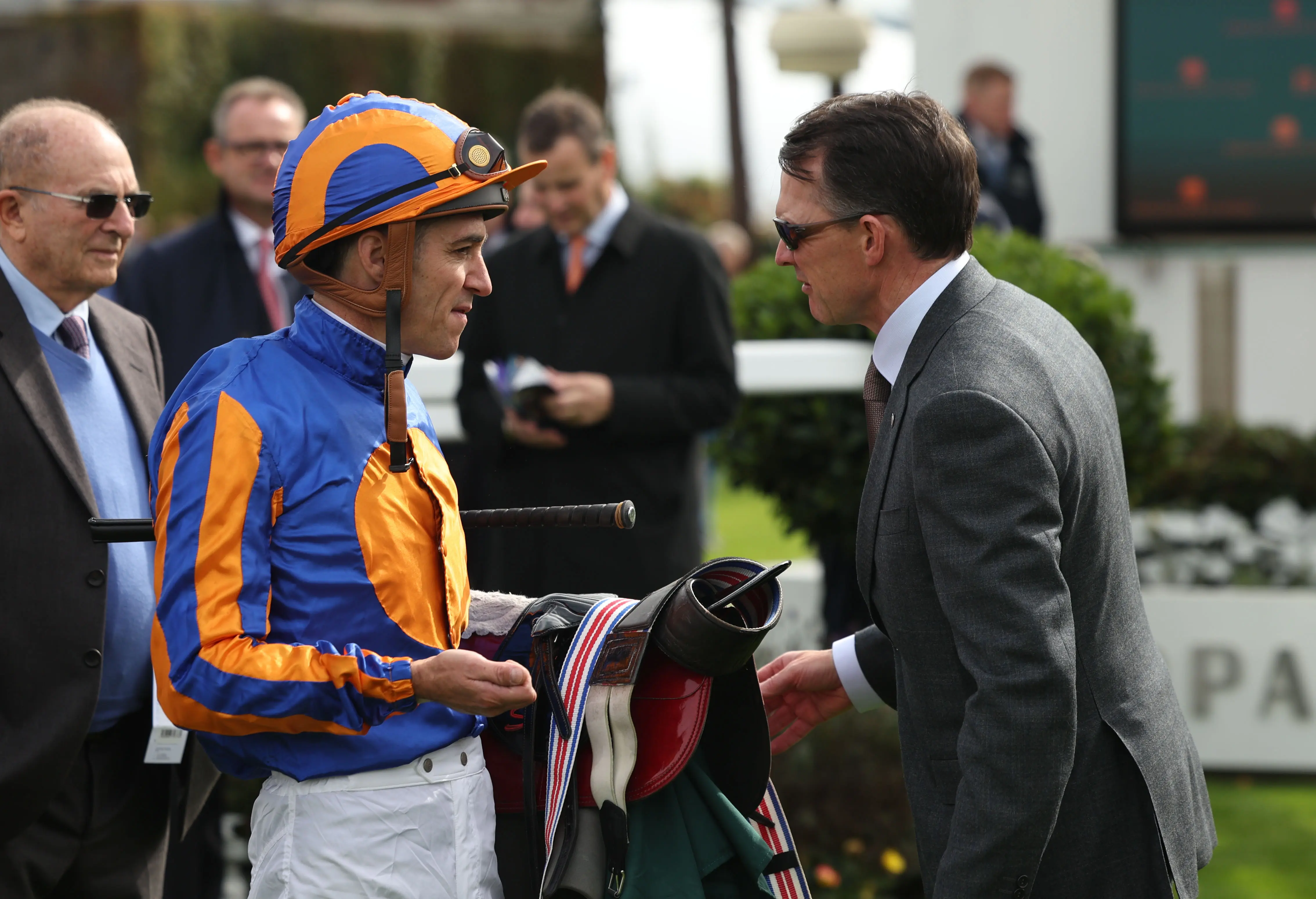 Christophe Soumillon chats tactics with Aidan O’Brien (Damien Eagers/PA)