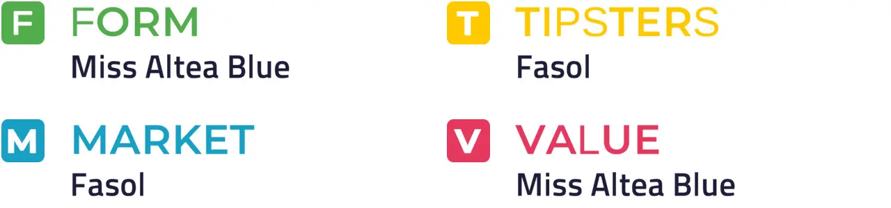 Specific Pace Hint: This could develop into a sprint for home, and Miss Altea Blue could be well placed to capitalise: Of the better-fancied horses, Fight My Fire is most likely to be ridden furthest from the pace.
