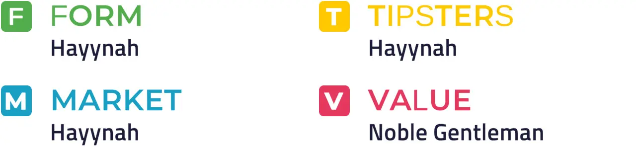 Specific Pace Hint: This could develop into a sprint for home, and Hayynah could be well placed to capitalise: Of the better-fancied horses, Noble Gentleman is most likely to be ridden furthest from the pace.