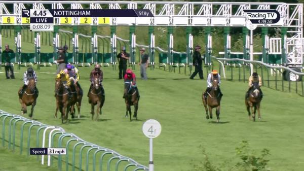 Walked to post, prominent in near-side group early, short of room 2f out, switched left and made rapid headway when in the clear 1f out, led just before final 110 yards, asserted and ran on strongly final 50 yards, very good effort under the circumstances