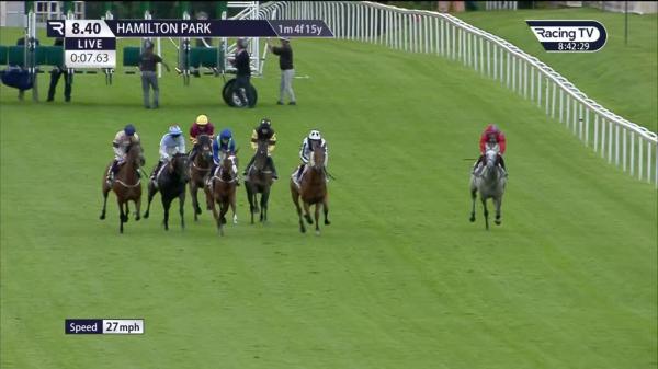 Mounted on course and led to post, steadied start and awkwardly away, pulled hard in rear, rapid headway tracking leaders 9f out, ridden over 3f out, weakened over 2f out