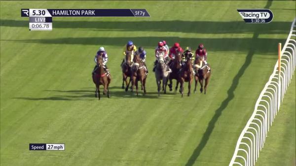 Went badly left and hampered rivals start, good speed to lead in centre, ridden hung badly left to near side rail and rider dropped right rein over 1f out, ran on well, unchallenged