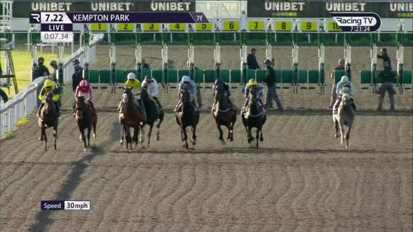 Restless in stalls, held up off the pace towards rear, good headway out wide over 1f out, went 2nd inside final furlong, stayed on towards finish, always held